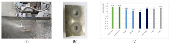 The sandblast test was carried out on waterjet cutting equipment. A combination of waterjet and abrasive nozzle was used for testing (Figure 16a). The abrasive used was ClassicCut 80, garnet-GMA. The 35 mm × 40 mm specimens were ground to a roughness of 0.8 Ra before abrasion. The test was always performed on two samples (Figure 16b). The weight before and after the test was measured on a laboratory balance. For each sandblast test, 20 g of abrasive was used, and the blasting was carried out for 200 s from a height of 100 mm with a pressure of 4130 MPa.
