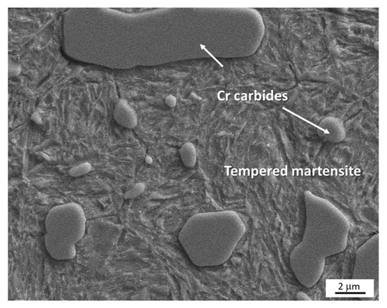 After tempering at 300 °C/2 h, the matrix showed the character of a tempered structure (Figure 6). The hardness value decreased from 738 HV10 to 663 HV10. The fraction of retained austenite only decreased to 36%.