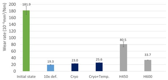 The same processing modes as the sandblast test were tested, including a comparison with Hardox 450 and Hardox 600 (Figure 18). The results show that the test again replicates the hardness values and is highly dependent on the type of structure tested. The highest through-wear rate of 181.9 × 10−6 mm3/Nm was found for the initial condition, whose structure consisted of a ferritic matrix, fine cementite, and primary chromium carbides. The lowest values were then achieved after semi-solid processing with 10 deformation steps and after combination with cryogenic processing, where the wear rate ranged from 19.3 to 23.0 × 10−6 mm3/Nm (Figure 17). The higher wear rate for the specimen after cryogenic processing with a higher hardness value compared to the regime with 10-deformation steps was probably due to the higher brittleness of the material that broke out of the formed traces during the test, which led to the detection of higher wear rate. This breakage is due to the lack of surface plasticity and the more brittle structure compared to the structure without cryogenic treatment. The breakage is generally smaller, but the frequency is higher. In the non-cryogenically processed state, bulkier fragments with a lower frequency can be expected []. The Cryo + Temp sample also had a higher tendency to break out due to the higher hardness compared to the sample without cryogenic treatment (10 def.).