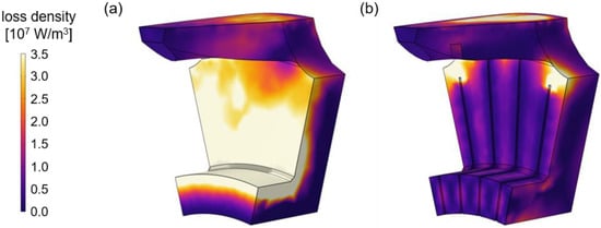 Simulated spatial distribution of the electromagnetic loss density per unit volume within a pole of the stator half-shell to be manufactured. (a) Pole without integrated slits. (b) Pole with 4 integrated slits.