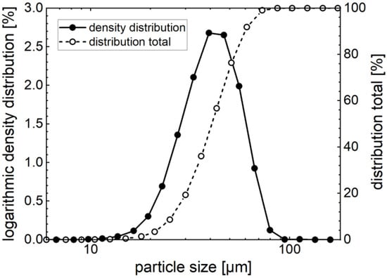 Volume-specific particle size distribution of the powder used for additive manufacturing (99.9% pure iron) determined by laser diffraction. The median of the particle size distribution is about 41 µm.