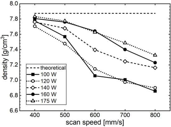 The parameter study was analyzed primarily with regard to the density of the specimens. It was found that the density of the specimens decreases with increasing scanning speed (Figure 6). The best results were achieved with the parameter set 175 W, 400 mm/s and a resulting component density of 7.83 g/cm³, which corresponds to a relative density of 99.4% regarding the nominal density of pure iron (7.874 g/cm3). Increasing the scanning speed to 500 mm/s leads to a slight reduction of the density to 98.7%.