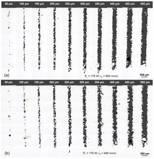 Cross-sections of the slits of different widths in the additively manufactured 99.9% pure iron specimen taken by optical microscopy at constant laser power (PL = 175 W) and different scanning speeds: (a) vs = 400 mm/s. (b) vs = 500 mm/s.