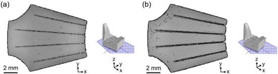 The analysis of the slits of widths between 50 and 500 µm showed that, only from a modeled slit width above 200 µm, continuous air gaps could be generated (Figure 7). Especially for small slit widths of 100 and 150 µm, the parameter combination PL = 175 W and vs = 500 mm/s showed advantages with respect to slit quality. This is why this parameter set was also used for the final component production. The better quality of the edge and slit areas at vs = 500 mm/s justifies the minimally lower density at PL = 175 W. The components produced, however, had a lower density than those produced at vs = 500 mm/s. However, the manufactured slits tended to have smaller widths than specified in the design. Thus, after additive manufacturing, instead of the nominal slit widths of 150 and 300 µm, the actual slit widths were in the range of 0–100 µm and 75–190 µm, respectively.