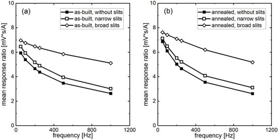 The component without slits exhibits the lowest response ratio and thus the highest iron losses in the frequency range from 50 to 1000 Hz (Figure 10). By integrating narrow and wide slits, the response ratio RR at 50 Hz improves by approx. 9% and 17%, respectively. As frequency increases, the differences in response ratio become more pronounced. At 1000 Hz, for example, the component with narrow or wide slits improves by approx. 15% and 95%, respectively, in relation to the component without slits. The heat treatment significantly increases the response ratio at low frequencies for all three components. At 50 Hz, the component without slits improves by approx. 16%; the component with narrow slits by approx. 10%; and the component with wide slits by 9%. However, at higher frequencies the improvement is significantly lower. Thus, at an excitation frequency of 1000 Hz, the heat treatment leads to an improvement of only 2.9% for the component with narrow slits; 1.3% for the component with wide slits; and 0.4% for the component without slits.
