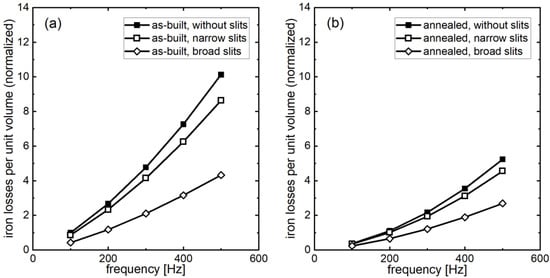 The iron losses measured using the commercial measuring device are all normalized to the measured value of the compact component as built at 100 Hz. The reason for the normalized specification is the fact that, unlike a conventional measurement, the measurement setup is not a closed magnetic circuit and the ring geometries used for calculating H and J do not correspond to reality. Therefore, it cannot be assumed that the measured values also correspond to the actual losses. However, since the components have the same global dimensions among themselves, the results are comparable. Therefore, a qualitative statement can be made about the influence of the inserted slits and the heat treatment.