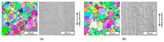 The investigated materials were the stable austenitic steel AISI 904L in solution annealed state (T = 1100 °C, t = 30 min, quenched in H2O) and the metastable austenitic stainless steel AISI 347, also solution annealed (T = 1050 °C, t = 35 min, quenched in He). Both materials consist of a purely austenitic microstructure in the initial state, have no preferred crystallographic orientation, and contain twins from solution annealing (Figure 1). The grain size including twins is 38 μm for the AISI 904L and 17 μm for the AISI 347. Optical micrographs (Figure 1b,d) show, aside from the grain structure, a band-like structure in the axial direction of the specimen, which indicates a heterogeneity in the chemical distribution [17]. To characterize the metastability of both materials, the Ms,Eichelmann temperature [18], Md30,Angel temperature [19], and stacking fault energy (SFE) [20] were calculated according to the chemical composition of the investigated materials (Table 1). The values indicate the stability of AISI 904L and the metastability of AISI 347. Consequently, the metastable AISI 347 is prone to deformation-induced transformation from paramagnetic γ-austenite to paramagnetic ε-martensite as well as to ferromagnetic α´-martensite. Mechanical properties determined in tensile tests at ambient temperature estimated according to the DIN 50125 standard as well as ferromagnetic α´-martensite fractions after specimen failure measured by magnetic Feritscope™ signal (ξ) in FE-% [2] are given in Table 2.