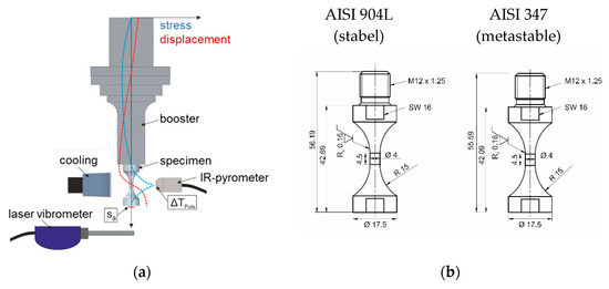 It is well known that austenitic stainless steels (ASSs) can exist in stable or metastable state dependent on their chemical composition [1,2]. Hence, the paramagnetic austenite can transform due to plastic deformation to a more stable microstructure, i.e., paramagnetic ε-martenisite and/or ferromagnetic α’-martensite [3]. Because during the discovery of ASSs the passivity (and hence “stainlessness”) was the main scope of material development and not the metastability as well as its influence on the mechanical and physical behavior, still extensive experimental work is done at this class of materials. Investigations of ASSs up to the very high cycle fatigue (VHCF) regime show different fatigue behavior depending on their level of metastability. Carstensen et al. [4] performed fatigue tests with tubes of stable AISI 904L and determined specimen failure in the VHCF regime with crack initiation at the surface. Therefore, in stable austenitic stainless steels, no classical fatigue limits up to load cycles N = 107 exist. Comparable results for AISI 316L were found by Lago et al. [5]. A continuous decrease of fatigue strength was detected up to N = 1 × 109. Crack initiation occurred at the surface at all specimens. Subsurface fish-eye fracture without inclusion in austenitic stainless steel SUS 316NG was observed in pre-strained specimen by Takahashi et al. [6] as well as surface crack initiation in the VHCF regime. Grigorescu et al. [7,8] investigated additionally to “quasi-stable” AISI 316L the metastable austenitic AISI 304L. For AISI 304L, a true fatigue limit was detected associated with α’-martensite formation, i.e., specimen failure of AISI 304L only occurs below N = 1 × 106 load cycles. For AISI 904L, a clear decrease of fatigue strength in VHCF regime occurs with crack initiation at twin boundaries [7].