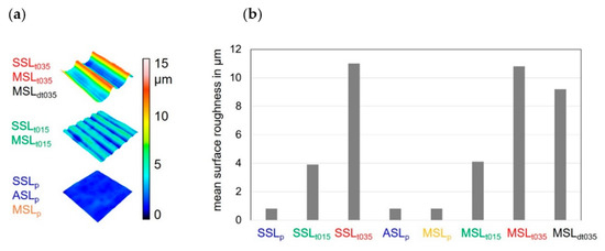 To eliminate the relatively high roughness formed by the turning process and to investigate only the influence of the martensitic surface layer on the fatigue behavior, the specimens of the metastable AISI 347 were manufactured by cryogenic turning with lower feed f1 = 0.15 mm/rev and subsequently polished. This morphology is named MSLp for Martensitic Surface Layer polished. The mean roughness (Rz) of the surfaces of all investigated morphologies determined with confocal microscopy is given in Figure 3. In general, three levels of the roughness in dependency of the feed rate can be seen (Figure 3a). The polished specimens have a smooth surface with an average roughness value below Rz = 1 μm. The roughness values of the turned specimen is dominated by the grooves resulting from the chosen feed in turning process. Hence, the low feed rate f1 = 0.15 mm/rev leads to smaller Rz of ~4 µm and higher f2 = 0.35 mm/rev to higher Rz up to ~11 µm, while the polished surface is standard for fatigue tests, which focus on the determination of fatigue limits of the materials, the turned variants represent typical technical surfaces. Generally, the surface roughness has a large influence of the fatigue properties and typically reduces fatigue life. However, previous results for metastable austenitic steles show that the negative influences of the high surface roughness of fatigue life in the LCF/HCF regime can be compensated by near surface martensite formation during cryogenic turning [11,12], which opens a new perspective to increase the fatigue life of components.