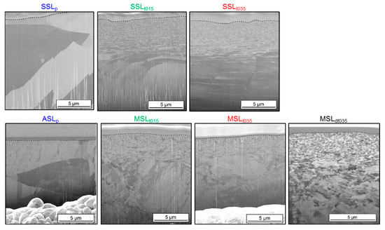 Scanning-ion microscopy (SIM) investigations were performed at FIB cross sections, which were positioned in the gauge length of the VHCF specimens in axial direction in the middle of a turning groove (Figure 4). ASLp and SSLp show the microstructure as the initial state (comp. Figure 1), i.e., purely austenitic grains with different grain size. No influence of the production process can be observed. In contrast to that, the cryogenic turned specimens show a nanocrystalline layer (NL) under the surface, with a maximum layer thickness of about 5 μm caused by cryogenic turning. A dependency of the NL thickness on the feed rate cannot be seen. SIM micrographs of the MSLdt035 sample indicated aside from the NL a fine microstructure, which is a result of pre-deformation before final cryogenic turning.