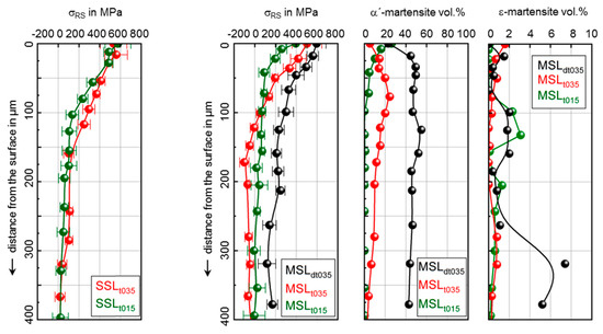 Aside from the surface roughness (Figure 3) and near surface microstructure (Figure 4), residual stresses and phase distribution below the specimens’ surface influence the fatigue performance. Figure 5 shows the residual stresses (σRS) and phase distributions of all investigated morphologies. The information for polished specimens (SSLp, ASLp, MSLp) correspond to the state at a distance of about 20–30 µm from the surface. All morphologies show relatively high tensile σRS at the specimen surface. The maximum σRS = 750 MPa was measured at MSLdt035 and the smallest one on MSLt015 with σRS = 400 MPa. The σRS reduced to nearly zero at ~50 µm distance from the surface for MSLt015 specimens. The residual stresses for MSLd035 decreased from σRS = 750 MPa to 200 MPa at ~100 µm distance from the surface and remained constant. A typical change from tensile to compressive residual stress as described in literature [25] was only observed for MSLt035. Note that, since the specimens with the morphologies ASLp, SSLp, SSLt015, and SSLt035 consist of a purely austenitic microstructure, the respective phase distributions are not shown in Figure 5. Γ-austenite, α’- and ε-martensite content was measured in the other morphologies of AISI 347 (MSLt015, MSLt035, and MSLdt035). All three morphologies have a maximum content of α’-martensite not directly at the surface but in some distance from the surface: MSLt015 at 15 µm with α’ = 18 vol.%, MSLt035 at 80 µm with α’ = 23 vol.% and MSLdt035 at 12 µm with 45 vol.%, which corresponds to the fraction caused by pre-deformation. The penetration depth of the X-ray is a few micrometers, so in the first X-ray step, the nanocrystalline structure strongly influences the measurement. However, the strong decrease of α’-martensite in the MSLdt035 from 45 vol.% to 23 vol.% indicates a possible back transformation to austenite during the manufacturing process. Only minimal amounts of ε-martensite were found. The MSLt015 shows a slightly lower α’-martensite content, which at 98 μm drops to almost 0 vol.%. This coincides with findings in the literature, which show higher α’-martensite proportions with increasing feed in the cryogenic turning [12]. With the disappearance of α’-martensite, small proportions ε-martensite appear of maximum 7 vol.%.