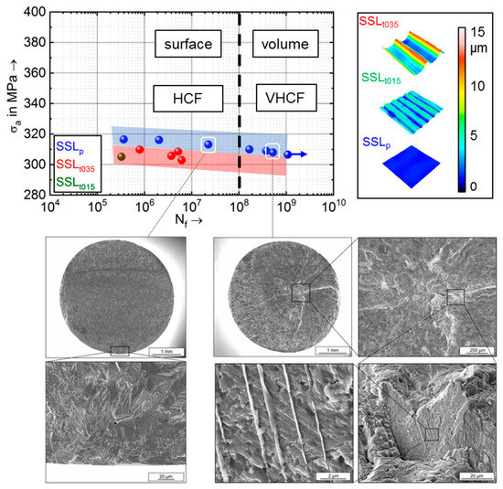 To study the fatigue behavior of the stable ASS, single step fatigue tests at a load ratio R = −1 were realized at room temperature up to the VHCF range with a maximum number of load cycles of 1 × 109 with the ultrasonic fatigue system with the load frequency of ~20 kHz (see Section 2.2). The S-N diagram of the samples with the three different surface morphologies is shown in Figure 6; run out is marked with an arrow. The specimens with the morphology SSLp failed in the HCF and the VHCF regime. With decreasing stress amplitude, the number of cycles to failure increased until the ultimate number of cycles is reached. Hence, no classical fatigue limit exits. A similar fatigue behavior was also observed by Carstensen et al. in fatigue tests at thin tubular specimens from AISI 904L [4]. At a stress amplitude of σa = 306 MPa, the tested sample with SSLp reaches the limiting number of cycles without failure. All cryogenically turned specimens exhibit earlier failures than the specimens with SSLp at the same stress amplitude, where the sample with the morphology SSLt015 had the lowest lifetime. Specimen failure occurred only at the specimens’ surface due to the high roughness of Rz = 4 µm (SSLt015) and Rz = 11 µm (SSLt035) in HCF regime. The influence of the surface roughness and the high tensile residual stresses seem to be predominant compared to the positive influence of the nanocrystalline structure (Figure 4), which in general reduces the plastic deformation in the specimen [13]. Therefore, no increase of fatigue life was achieved by cryogenic turning of stable ASS. Feritescope™ measurements confirm that no phase transformation occurred during the fatigue tests. Fractographic investigations on the failed specimens with SSLp show that for Nf > 1 × 108, the crack initiation changes from the surface to the volume (Figure 6). Volume defects, such as inclusions, could not be detected. Note that internal cracks can also occur in metallic materials without the presence of inclusions and, e.g., stress concentrations at the grain boundaries can have a crack-initiating effect, especially in the VHCF regime [26,27]. Takahashi and Ogawa also detected on a prestressed sample in compression an internal crack with a fish-eye structure without any internal defect [6]. However, in most cases when examining ASSs up to the VHCF range, surface cracks or cracks originating in the immediate vicinity of the surface are observed [4,5,28]. Bright areas are visible around the start of the crack at a distance of a few 100 μm on which there are extrusions (Figure 6). Probably during micro-crack growth, two halves of the sample do not have contact with each other and in this area, the extrusions developed at the surface fracture.