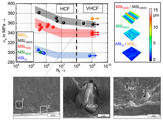 The influence of metastability on the VHCF behavior is very clearly seen by comparison of the S-N curves of both ASSs (Figure 6 and Figure 7); run outs are marked with an arrow. The specimens from metastable AISI 347 with purely austenitic microstructure in the initial state and with different surface morphology only failed in the HCF regime at N < 107. In the VHCF regime, no specimen failure occurred, which shows that a true fatigue limit exists for this metastable austenite. Only the pre-deformed specimens failed in the VHCF regime, which is consistent with literature for different metastable austenitic steels [8,29,30]. During cyclic loading, the metastable AISI 347 transforms from paramagnetic γ-austenite to ferromagnetic α’-martensite, which is confirmed by Feritscope™ measurements. Hence, the surface morphology influences the fatigue behavior of metastable AISI 347 completely differently in comparison to the stable AISI 904L. The specimens with morphology MSLt035, which exhibit nanocrystalline and martensitic layers show higher fatigue strength despite of the higher roughness values (Rz = 11 µm) and tensile residual stresses (504 MPa) than the conventionally turned and polished specimens with the ASLp morphology and resulting small roughness of Rz = 1 µm and compressive residual stresses (−20 MPa). The fatigue strength of specimens increased after cryogenic turning about 50 MPa. The scatter of MSLt035 specimens failed in the HCF-regime was higher than that of the variant ASLp, which is caused by the turning process resulting in irregularities by chip formation and chip breaking. The results show that the martensitic surface layer in combination with the nanocrystalline structure had a very positive effect on the fatigue behavior in VHCF regime, whereas only a nanocrystalline structure did not lead to higher fatigue life as shown for stable AISI 904L (comp. fatigue life SSlp with SSLt035 in Figure 6). This results from the low roughness, the martensitic surface layer, and the compressive residual stresses at the specimens’ surface. The fatigue tests with MSLdt035 specimens were demanding the maximum displacement amplitude of the ultrasonic using testing system. It was not possible to perform higher stress amplitudes than σa = 381 MPa due to the high internal friction of the austenite in the specimens’ volume. Nevertheless, an increase of fatigue strength for the morphology MSLdp was determined. In contrast to the results from specimens without pre-deformation, failure in the VHCF regime occurred in specimens with the morphology MSLdt035 and the data points show a drop in the S-N diagram. Such behavior could also be observed in a metastable austenite with a α’-martensite content of 54 vol.% achieved by pre-deformation [30]. Using scanning electron micrographs, the fracture surfaces of specimens with the morphology MSLdt035 were examined. Figure 7 shows SEM micrographs of the MSLdp specimen failed at N = 2.8 × 108 cycles. The fracture surface contains an AlCaO inclusion, and a niobium carbide a few microns below the surface. The fracture topography around the NbC indicates that crack initiation originated from the carbide. Hence, the deeper located subsurface AlCaO inclusion was fractured by crack growth. In general, the pre-deformation with deformation-induced martensite formation increases the HCF fatigue strength. However, in the VHCF regime, a drop of fatigue strength occurred. Taking into account the fatigue life of the specimen with the morphology MSLp, it becomes clear that, even compared to the cryogenically turned samples with partially converted volume (morphology MSLdt035), the MSLp samples have a higher fatigue strength in the whole fatigue regime.