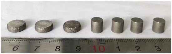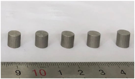 FeNiCoCr HEA samples used in the quasi-static and dynamic compression tests were fabricated using the vacuum induction melting (VIM) technique. The ingot was divided into five parts, four of which were annealed at 600 °C, 750 °C, 850 °C, and 1000 °C for 6 h and then cooled, respectively. The density of the HEA is 8.2 g/cm3. Cylindrical samples for the test, shown in Figure 1, were cut by the wire cut electrical discharge machining (WEDM) (Taizhou Tianlong Wire-cutting Machine Tool Co., Taizhou, Jiangsu, China) apparatus. The FeNiCoCr HEA samples annealed at different temperatures have no obvious difference in appearance. Samples used in the quasi-static and dynamic compression test were Φ7 mm × 7 mm and Φ4 mm × 5 mm in size, respectively.