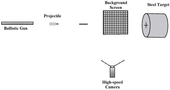 The experimental layout is shown in Figure 5. Annealed FeNiCoCr HEAs LRPs were launched by a 14.5 mm ballistic gun under different velocities ranging from 650 m/s to 1500 m/s. The trajectory of the projectile and penetration process was recorded by a high-speed camera. The impact velocities of the LRPs were calculated by analyzing the relative position recorded in the background screen. The muzzle was 1.2 m away from the semi-infinite steel target with a diameter of 120 mm and a length of 100 mm, while the trajectory line was perpendicular to the target surface. The projectile velocity was controlled by adjusting the mass of the propellant.