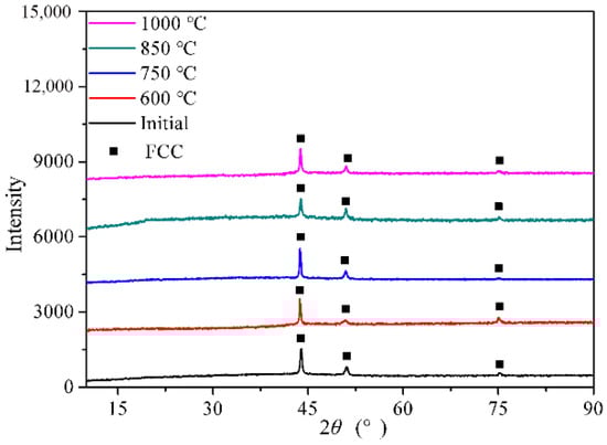 Figure 6 shows the microstructure of FeNiCoCr HEAs annealed at different temperatures. Diffraction peaks corresponding to a face-center cubic (FCC) crystal structure were observed in the XRD pattern. The peaks of FeNiCoCr HEAs annealed at 600–1000 °C had no obvious variation. It can be inferred that no phase transformation occurred in the FeNiCoCr HEAs with different annealing temperatures.