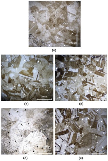 Microstructure of FeNiCoCr HEA samples annealed at different temperatures: (a) Initial, (b) 600 °C, (c) 750 °C, (d) 850 °C and (e) 1000 °C. Arrows in (a–e) mark annealing twins.