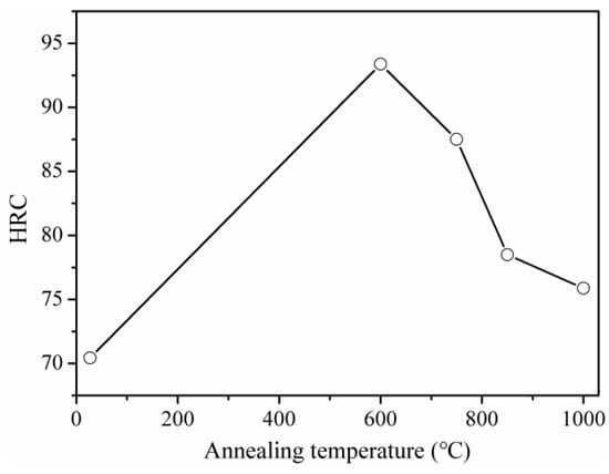 The microstructural evolution of alloys annealed at different temperatures is shown in Figure 7. It can be seen that the grain boundaries were fuzzy for the initial FeNiCoCr HEA, while some annealing twins extended from the grain boundaries to the interior, showing parallel bands that might have been formed in the melting process. The grain boundaries became obvious, and the number of annealing twins [,] increased in the alloy annealed at 600 °C. The grains of the HEA was obviously refined during the 750 °C annealing temperature. The annealing twins significantly reduced in the alloy annealed at 850 °C. With the increase in annealing temperature to 1000 °C, partial twins coarsened, and annealing twins increased. The Rockwell hardness (HRC) of FeNiCoCr HEAs samples is shown in Figure 8. Compared with the initial FeNiCoCr HEA, the HRC of the alloy annealed at 600 °C increased and then gradually decreased with the increase in annealing temperature, which might be caused by comprehensive differences [] in increasing annealing twins and refined grain size of the alloys shown in Figure 7.