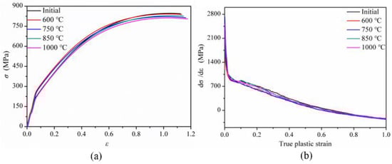 Figure 9 shows the comparison of specimens after the quasi-static compression test. The average length of samples compressed by the machine to a limit press of 100 kN is 2 mm, which is 71% less than that of the original sample. However, the samples still displayed the drum shape without appearing shear or fractured, indicating that the alloys had excellent plasticity. The detailed data are shown in Table 1. The true stress-strain curves and strain hardening rate versus the plastic strain curves were plotted in Figure 10. The curves show that the FeNiCoCr HEAs present obvious work-hardening behaviors. The strain hardening rate had a plateau section, as shown in Figure 10b, explaining how the twinning in the microstructure could improve the strength and ductility of alloys to a certain degree [], which interpreted why the strength of the FeNiCoCr HEAs in other annealing temperatures was higher than that of the initial FeNiCoCr HEAs.