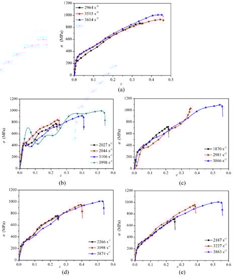 Furthermore, the true stress-strain curves of alloys loaded at different strain rates were obtained and shown in Figure 11. The work-hardening behaviors of the FeNiCoCr HEAs occurred at higher strain rates, the same as those in quasi-static compression tests. The yield strength of the FeNiCoCr HEAs increased gradually with the increase in strain rates, showing a positive strain rate strengthening effect in Figure 12.