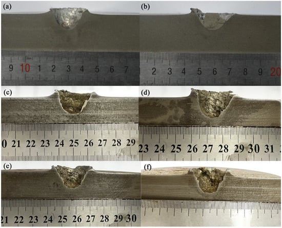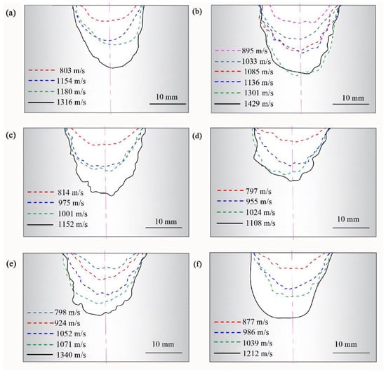 The effects of the projectile hitting the target: (a) Steel, FeNiCoCr HEAs annealed at (b) Initial, (c) 600 °C, (d) 750 °C, (e) 850 °C and (f) 1000 °C.