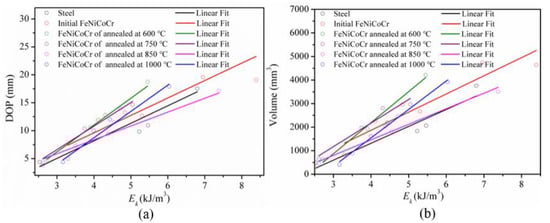 The results of penetration were normalized to study the performance of the projectile penetrating targets with the same kinetic energy, as shown in Figure 16. As the impact kinetic energy increased, the DOP and VOC of the LRPs of FeNiCoCr HEA annealed at 850 °C were similar to that of the steel LRPs. Among all five kinds of FeNiCoCr HEAs, the penetration performance of the alloy annealed at 600 °C performed the best. Compared with those of the steel LRPs, the DOP and VOC of LRPs of the alloy annealed at 600 °C were increased by 43% and 78%, respectively. Impact velocity played a more vital role in the FeNiCoCr HEAs annealed at 1000 °C than the FeNiCoCr HEAs with other annealing temperatures, while the penetration performance of the LRPs of FeNiCoCr HEA annealed at 850 °C is similar to that of the steel LRPs.