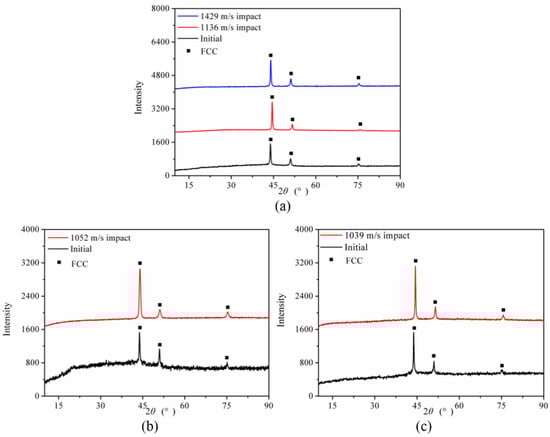XRD patterns of the projectiles picked up: (a) initial FeNiCoCr HEA LRPs, (b) FeNiCoCr HEA LRPs annealed at 850 °C and (c) FeNiCoCr HEA LRPs annealed at 1000 °C.