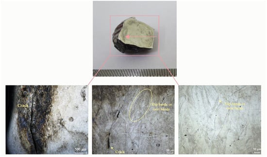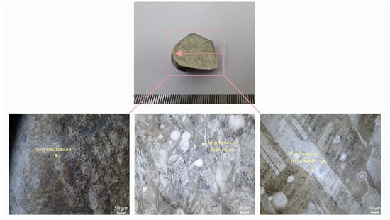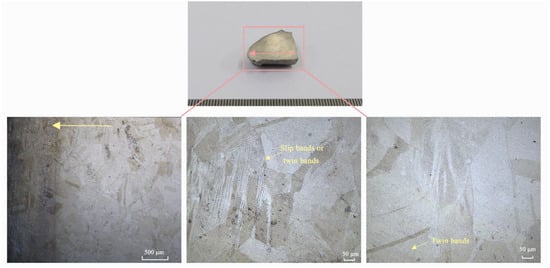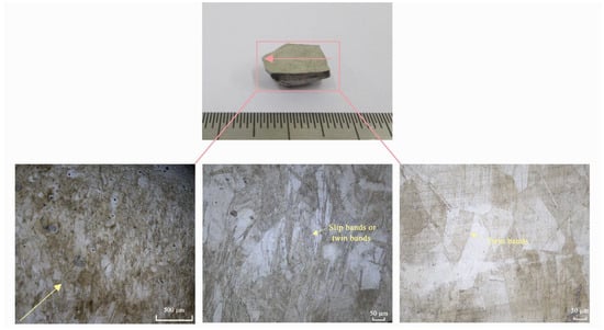 Figure 18, Figure 19, Figure 20 and Figure 21 show the OM results of recovered projectiles. The pink arrows without annotation referred to the scanning direction of projectiles. Significant deformation of projectiles, including blurred grain boundaries, appeared in the middle, and many twins or slip bands were observed. As the observation position moved backward to the tail of the projectiles, the deformation degree of the projectile decreased gradually; however, grain boundaries can be seen more clearly. The massive slip bands or twins were conducive to the strength of the projectile. Some cracks were observed in the microstructure of recovered projectiles of the FeNiCoCr HEA annealed at 850 °C, which shows the adiabatic shear failure. In addition, the adiabatic shear was proved to occur in other FeNiCoCr HEAs LRPs by observing the shapes of recovered projectiles. Moreover, the head of initial FeNiCoCr HEA projectiles was sharper as the impact velocity increased, and many recrystallized structures in the projectile of the FeNiCoCr HEA annealed at 1000 °C initiated, which can enhance the penetration performance of the projectile.