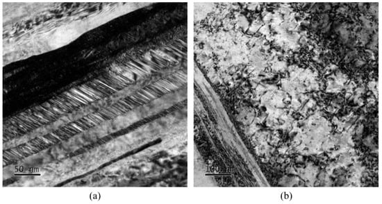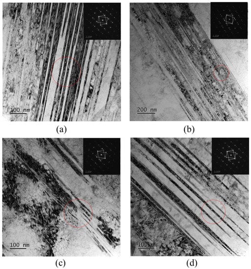 Microstructures of the LRPs of the FeNiCoCr HEAs annealed at various temperatures after penetration are presented in Figure 22, and the images were taken on the plane parallel to the deformation direction. All the TEM maps show the low-magnification bright-field (BF) image of the homogeneous twins; meanwhile, the corresponding selected area electron diffraction (SAED) pattern from red circles further confirms the twin symmetrical structure. Twinning is apparently a favorite deformation mode under high strain-rate penetration. When the FCC HEAs are subject to extreme deformation condition impact loading, twinning is a dominant mode of plastic deformation. Twinning can enhance strain hardening ability when metals during the plastic deformation, which can be attributed mainly to dislocation–twin boundary interactions, as well as an increase in twin density [,,]. Formation of twins during mechanical testing results in continuous grain fragmentation by the introduction of new interfaces, which effectively reduces the dislocation mean free path and causes strengthening []. In addition, multiple twinning can also be observed from samples during these penetrations (Figure 23a), which can induce higher strength and stronger strain hardening than single deformation twins. The underlying mechanism is that multiple twinning networks can present more barriers for dislocation motion to contribute to the higher strength []. Moreover, a high density of stack faults (SFs) is also beside twin in the experiments in Figure 23b. However, neither FCC to HCP nor FCC- BCC (body-centered cubic) phase transformation was found in the TEM observations, which always along with deformation twin boundaries [,], and phase transformation was suppressed by the high-temperature environment during penetration.
