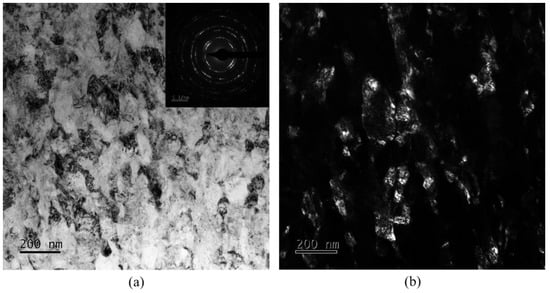 TEM images of the LRP of FeNiCoCr HEA annealed at 850 °C, v = 1052 m/s: (a) Bright-field TEM image of the microstructure of the front part; (b) corresponding dark-field TEM image of (a).