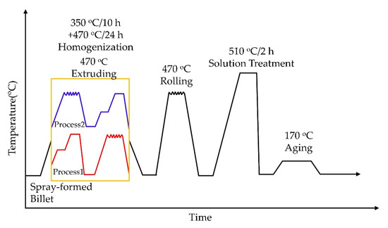 Two different thermo-mechanical treatments (TMT) were carried out for the ingot. (1) Process one (P1): homogenization–extrusion. The ingot was firstly two-stage, ramp heating homogenized at 350 °C/10 h + 470 °C/24 h (the heating rate of 50 °C/h) and water quenched to room temperature. Then hot extrusion at 470 °C with a ratio of 9:1 and a speed of 1.8 mm/s was carried on homogenized ingot for eliminating the porosity. (2) Process two (P2): extrusion-homogenization, the sequence of extrusion and homogenization is changed compared with P1, the parameters of the extrusion and homogenization are the same as P1. After then, the P1 and P2 processed alloys were hot rolled at 470 °C with a total reduction of 60%. The sheet was then solution treated at 510 °C/1 h, water quenched to room temperature and artificially aged at 170 °C for 12 h to obtain peak aging condition. The peak aged condition is selected based on the previous literature [7]. The schematic illustration of the two thermo-mechanical treatments is shown in Figure 1.