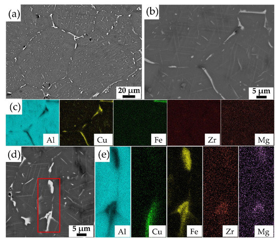 Figure 3 shows SEM images of the as-homogenized alloy (P1 process). After the introduction of two-stage homogenization, most of the primary phases dissolve into the matrix. The fine plate-like T1 phase in the interior of the grain completely disappeared. The network phases along the grain boundaries are also largely dissolved, but some needle or irregular-like residual phases are remaining in the matrix. The enlarged SEM image and corresponding EDS analysis of the residual phases are presented in Figure 3b,c. Two types of residual phases can be identified: Al7Cu2Fe and AlCuZr phases. Most of the AlCuZr phase is closely connected with the Al7Cu2Fe phase. These two phases are highly stable [19] and exhibit nearly no change in size, morphology, and content after homogenization.