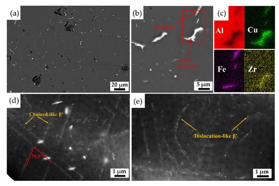 From the high-resolution SEM images shown in Figure 3d,e, a high density of fine spherical particles with sizes of about 50 nm is observed, these spherical particles can be identified as the β′ (Al3Zr) phase in terms of the published literatures [6,12,20]. Interestingly, in addition to the diffuse distribution of the spherical β′ phase, most of the β′ particles are aligned in the straight chains, displaying two different orientations with a crossover angle of 70.5°, corresponding to the orientations of the T1 phase observed in the as-deposited alloy (equivalent {111}Al planes). As a result of these observations, it can be deduced that the β′ phase is formed at locations where the T1 phase has dissolved. Similar behavior has also been reported by Wang et al. [16]. In addition, some shorter and curved chains of β′ precipitates are also observed in Figure 3e. These chains are not obviously aligned with any pre-existing precipitates, but are likely formed on matrix dislocations due to the reduced strain energy barrier in this region.