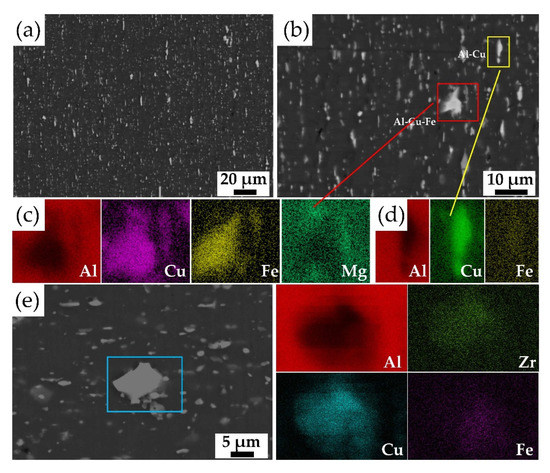 Figure 2 shows the representative SEM image and energy dispersive spectroscopy (EDS) quantification results of the as-deposited alloy. As shown in Figure 2a, the as-deposited alloy consists of fine equiaxed grains with grain sizes of about 30–50 µm. Some pores are visible in the alloy, which is the main drawback of the spray-formed alloy. Some discontinuously or semi-continuously network primary phases are distributed along the grain boundaries. Besides, abundant plate-like and irregular morphology phases are observed in the grain interior. Figure 2b shows the SEM image of primary phases under higher magnification. The compositions of these second phases were analyzed by EDS, and the results are shown in Figure 2c. Various types of primary phases, including Al-Cu, Al-Cu-Fe, Al-Cu-Mg, and Al-Cu-Zr phase can be identified. By comparing with the results reported in literatures [16,17,18], it can be judged that the Al-Cu phase is θ′(Al2Cu), the Mg-containing phase is S(Al2CuMg), and the Fe-containing phase is Aplate-likee plate -like particles in the interior of the grains can be identified as the T1 phase according to previous literature [16].