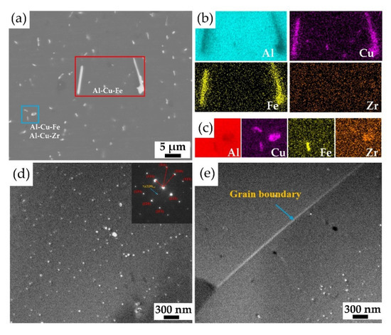 (a) SEM image of P2 homogenized alloy 2195; (b) and (c) EDS scan composition mappings of Al, Cu, Fe and Zr; (d) dark-fields TEM image of the β′ phase in one grain and the corresponding selected-area diffraction pattern (inserted); and (e) dark-field TEM image showing the β′ particles near grain boundary.