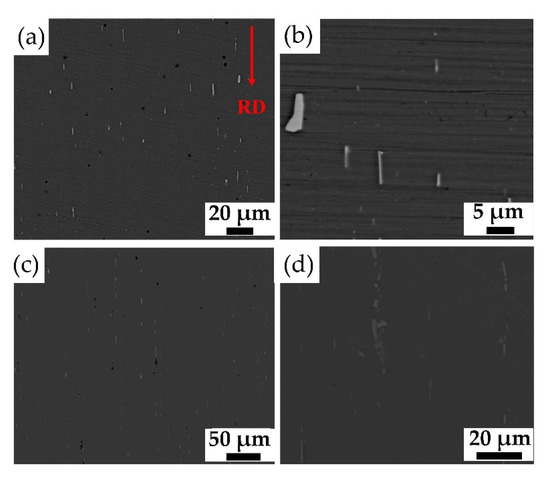 The P1 extruded and P2 homogenized samples were hot rolled and solution treated at 510 °C for 2 h. SEM micrographs of the P1 and P2 alloy after solution treatment are shown in Figure 6. Coarse elongated second-phase particles are distributed with their long axis parallel to the rolling direction. These particles can also be identified as Al7Cu2Fe and AlCuZr phases, indicating these two phases are stable during the whole TMP processing. The second phase distributions in the two alloys are almost the same after solution treatment.
