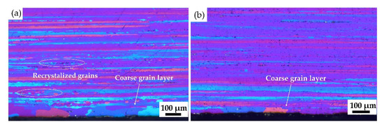 To reveal the effect of β′ phase in inhibiting the recrystallization of the two alloys after solution treatment. Polarized light optical microscopy (PLOM) at the longitudinal cross-section (RD-ND) of the two alloys is shown in Figure 7. Both alloys exhibit mainly a fibrous microstructure. Some necklace-like tiny grains can be observed at the fiber interface, indicating partial recrystallization occurred during solution treatment. However, on the surface of the two alloys, an abnormally coarse grain layer appears. The coarse grain layers in the P1 and P2 alloys are measured as 100 and 50 μm, respectively, indicating that the P2 process can obviously suppress the surface recrystallization of the alloy during solution treatment compared with the P1 process.