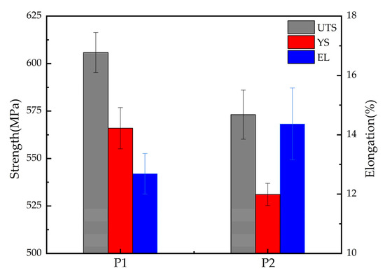 Figure 9 shows the tensile strength, yield strength, and elongation of P1 and P2 alloys under peak aged condition. It is evident that the yield, tensile strengths of the P1 alloy (566.0 10.8 MPa, 605.8 10.5 MPa) are higher than those of the P2 alloy (531.1 5.8 MPa, 573.1 12.9 MPa), while the elongation of the P1 alloy (12.7 0.7%) is lower than the P2 alloy (14.4 1.2%).