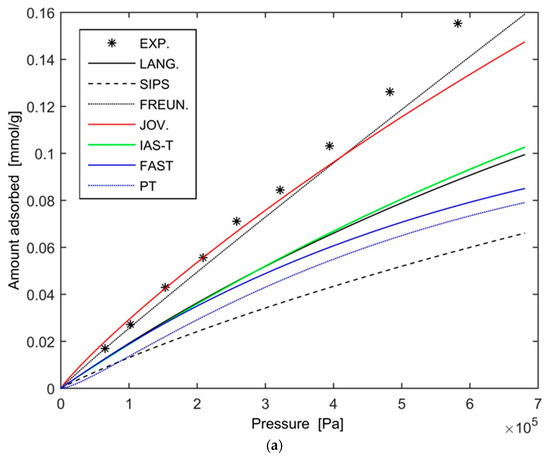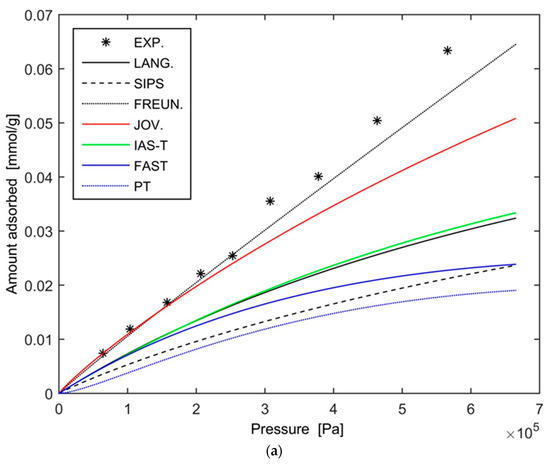 Figure 5c shows the results of the adsorption equilibrium of methane from the gas mixture. The best experimental results have been obtained by the potential theory, followed by the Fast-IAS and IAS theories, and the extended Langmuir equation. All these models describe very well the experimental points, whilst the extended Jovanovic, Freundlich, and Sips models provide underestimated, largely overestimated, and largely underestimated results, respectively.