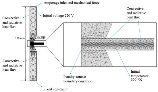 In this research, a two-dimensional axisymmetric model was used. According to Figure 2, two copper electrodes and two steel sheets, with specific dimensions, were considered and the axis of symmetry was the midline. In this figure, additionally, the thermal, electrical, and mechanical boundary and initial conditions and geometrical dimensions are demonstrated. Triangular elements were used for meshing. In the boundary of the samples, the penalty contact boundary condition was used for more accuracy. An implicit solver was applied to solve the equations. All the geometry and physics were created and solved using COMSOL multiphysics software (version 6.1, COMSOLAB, Stockholm, Sweden).