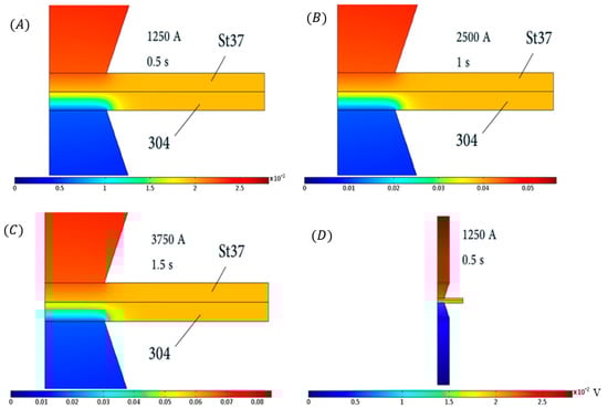 Simulation results of electrical potential distribution in the weld zone, (A) 1250 A and 0.5 s, (B) 2500 A and 1 s, (C) 3750 and 1.5 s, (D) electrodes 1250 A and 0.5 s.