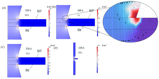 Simulation results of electric current distribution in the weld zone, (A) 1250 A and 0.5 s, (B) 2500 A and 1 s, (C) 3750 and 1.5 s, (D) electrodes 1250 A and 0.5 s.
