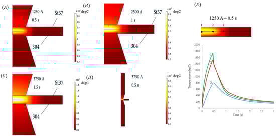 Simulation results of temperature distribution in the weld zone, (A) 1250 A and 0.5 s, (B) 2500 A and 1 s, (C) 3750 and 1.5 s, (D) electrodes 1250 A and 0.5 s and (E) is the thermal history diagram of three points in the weld zone and HAZ of 1250 A and 0.5 s specimen.