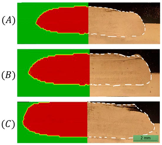 Evaluation of weld nugget simulation results with experimental results (A) 1250 A and 0.5 s, (B) 2500 A and 1 s, (C) 3750 and 1.5 s.