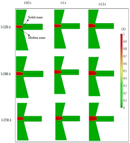 where R is the electrical resistivity and I is the current obtained in electrical simulation. The application of 220 V voltage was considered as the initial condition. Electric flux was applied from the upper surface of the electrode. Stainless steel, carbon steel, and copper temperature dependent material properties are extracted from previous research including Nandan et al.’s [24,25] and Moshayedi and Sattari-Far’s [16] works.