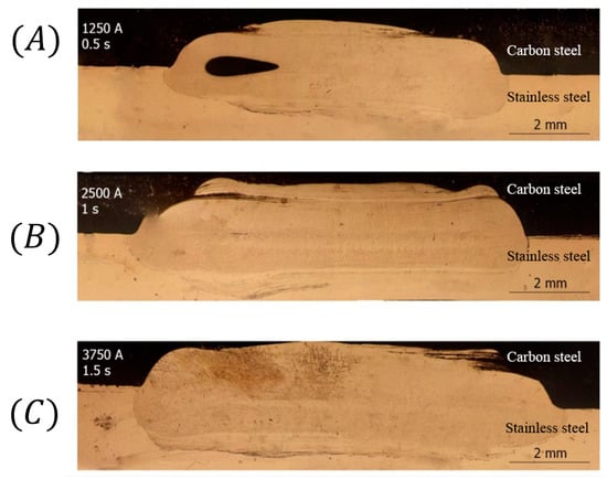 Macrostructure of the welding zone of dissimilar welding of 304 steel to carbon steel in different current and time conditions. (A) 1250 A and 0.5 s, (B) 2500 A and 1 s, (C) 3750 and 1.5 s.