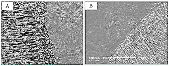 Scanning electron microscopic images for the melting boundary with (A) 304 steel, (B) carbon steel.