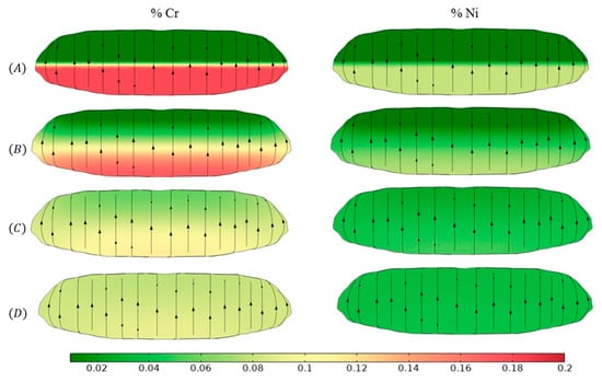 In order to simulate Cr and Ni solutes distribution and diffusion in the molten weld zone, Fick’s second law, according to Equation (7) was applied. Since the diffusion of the solutes in the molten zone coincides with being in an electric field, the flux equation of Fick’s second law was modified with the Nernst–Einstein equation [26], according to Equation (8).