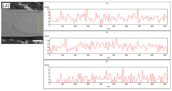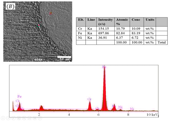 (A) Linear EDS analysis of distribution of Fe, Cr and Ni elements in the weld zone, (B) point EDS analysis of weld nugget.