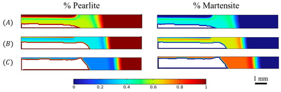 Simulation results of martensite distribution in HAZ region, (A) 1250 A and 0.5 s, (B) 2500 A and 1 s, (C) 3750 and 1.5 s.